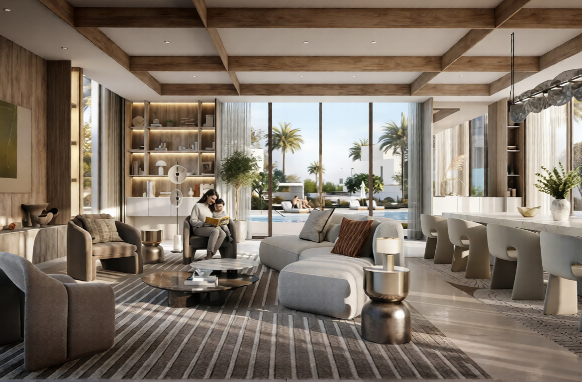 Luxury Escapes proudly presents this beautifully designed 5-bedroom villa located in Ovelle at The Valley, a serene, family-focused community that blends modern living with open green spaces.